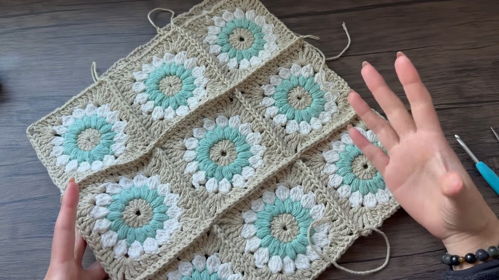 - Varies based on the size of your granny squares. Each square is roughly 4–5 inches, creating an approximate 12 x 12 inch bag body.