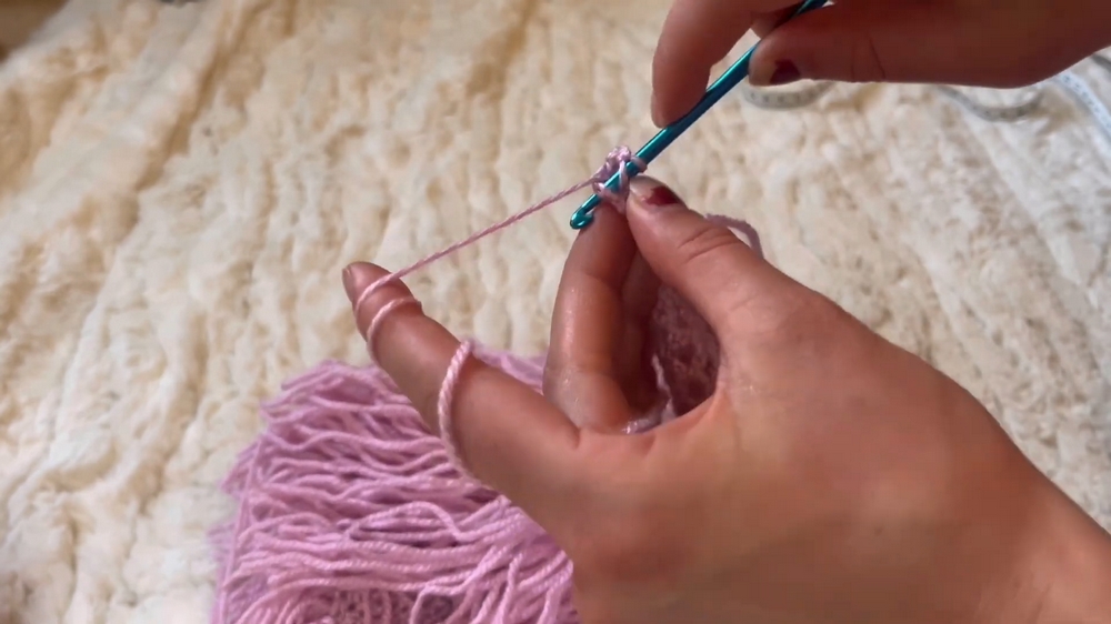 - Make a slip knot and pull the loose thread to secure it. Chain 30 stitches, resulting in a starting length of about 15 cm.