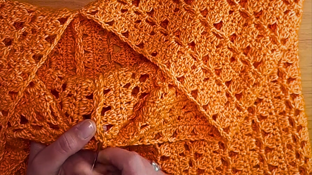 The process begins by crocheting two rectangular panels, composed of fundamental stitches like double crochets, single crochets, and slip stitches.
