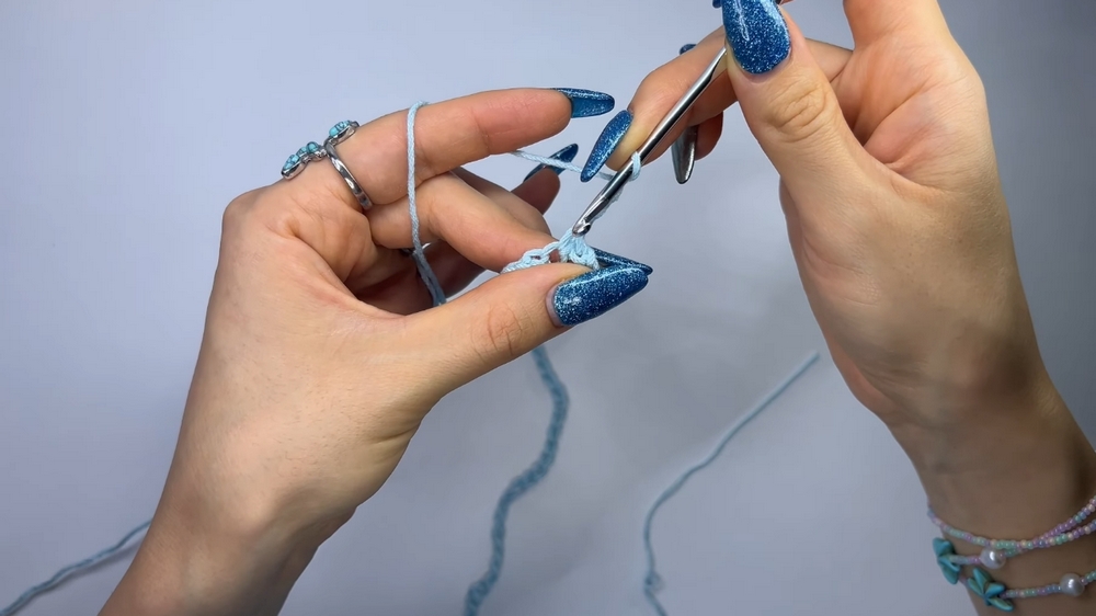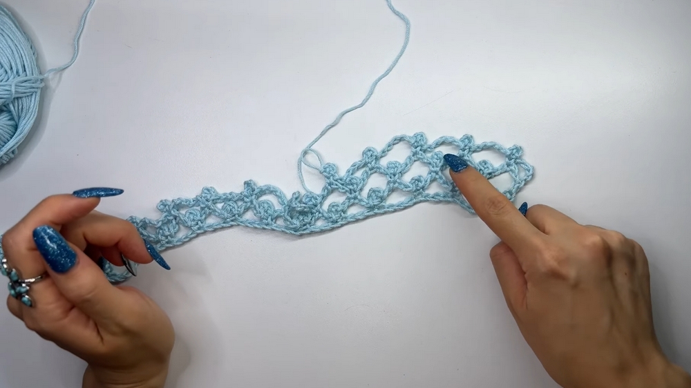 The Arcos Stitch Blouse begins with a simple series of foundation chains, gradually building its iconic arched design through repeated rows of double crochet and chain stitches.