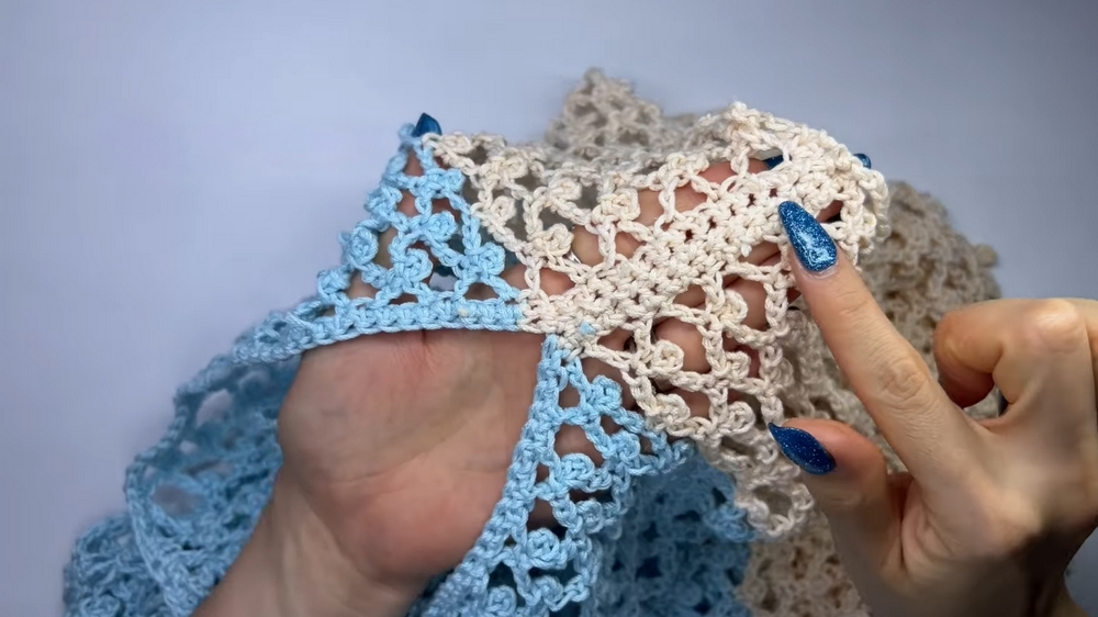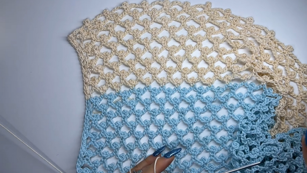 By the midsection, the interplay of these stitches creates a rhythmic and captivating texture that stands out while allowing the fabric to stretch and drape elegantly over the body. As you near the final stages, the edges and neckline are accented with slip stitches, neatly framing the blouse for a polished, finished look.