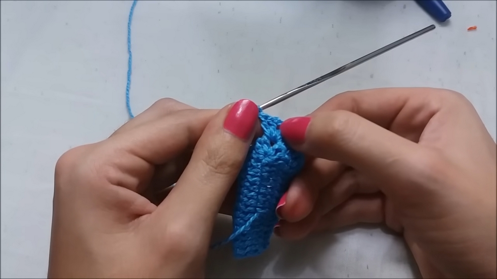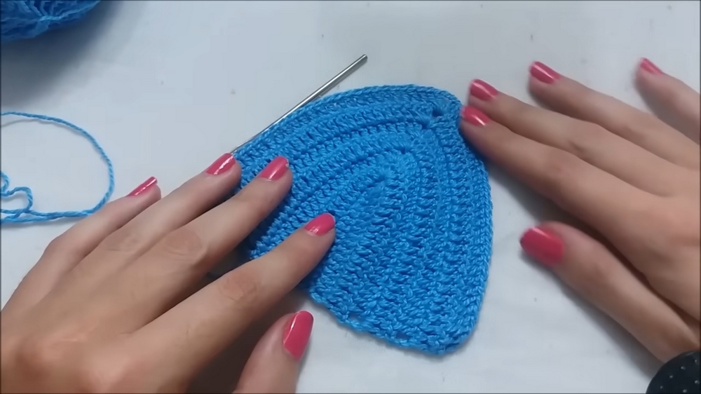- Add three double crochets in a single stitch at the center of each row to create the curve for the triangular bikini shape.