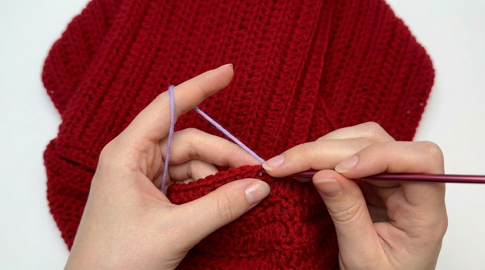 - Turn the sweater onto its wrong side and attach the ribbing using sc, ensuring each section aligns.