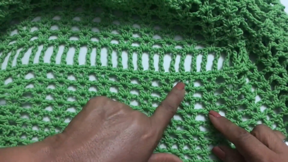 This blouse is crocheted in two separate pieces: the front and the back, allowing flexibility in design modifications. The rows include a combination of foundational chain stitches, “houses” (open spaces within the lacework), and decorative patterns.