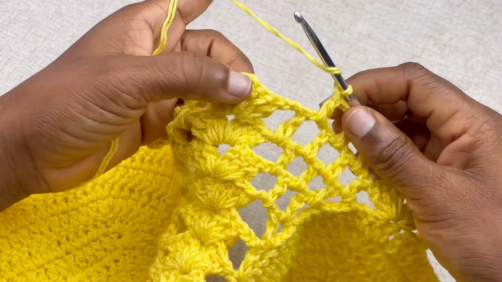 As the pattern develops, the mid-section stands out with its dynamic rows of double crochets and strategic increases. Alternating double crochets and chain spaces give the lacework its delicate, airy feel.
