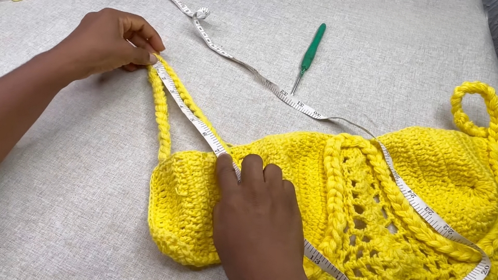 Special features include eight double crochets around the midpoint of the rows, with these becoming key focal points for consistent symmetry. The yarn work ensures that each section, whether the front panel, back panel, or edges, seamlessly transitions into the other. For added comfort and functionality, the top incorporates sturdy yet elegant straps that crisscross at the back, forming a balanced fit for support and style.