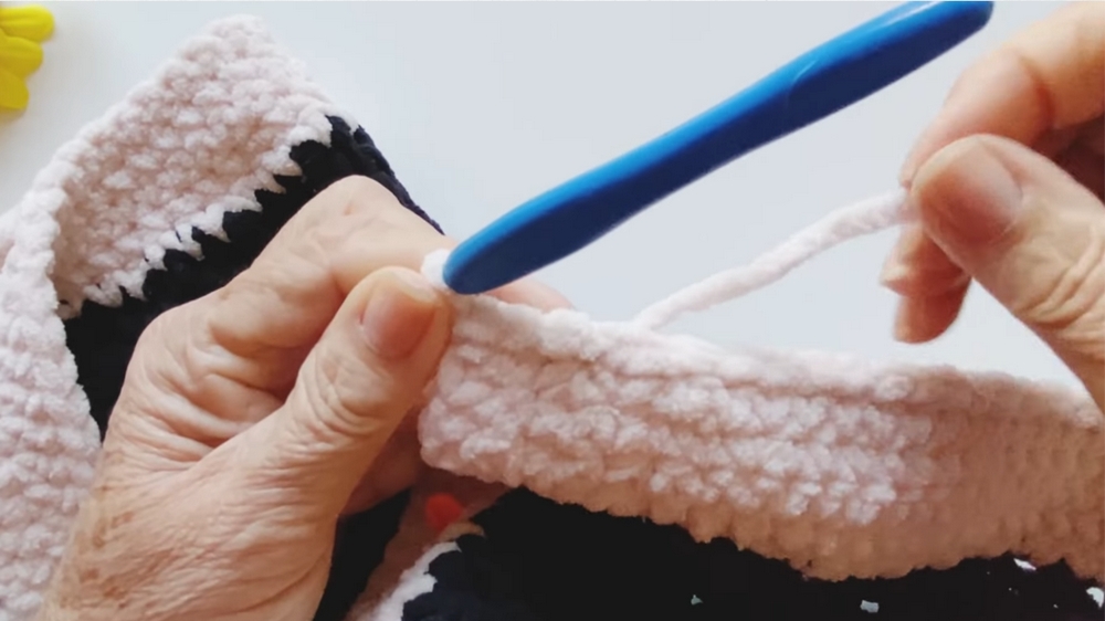 - Count 1…4 chains, then start making double crochets from the fourth chain onward, completing a total of 102 double crochets in the first row.