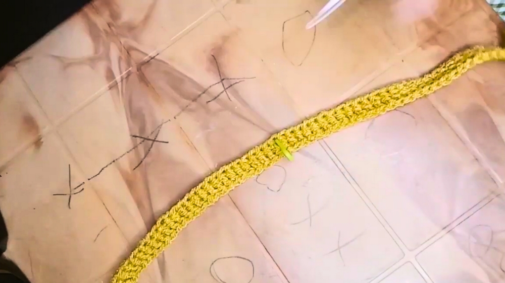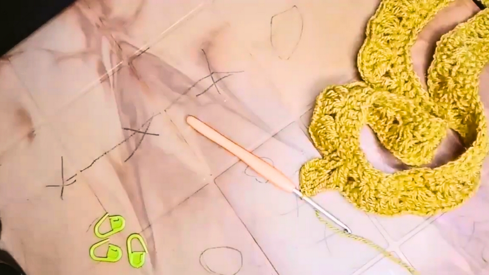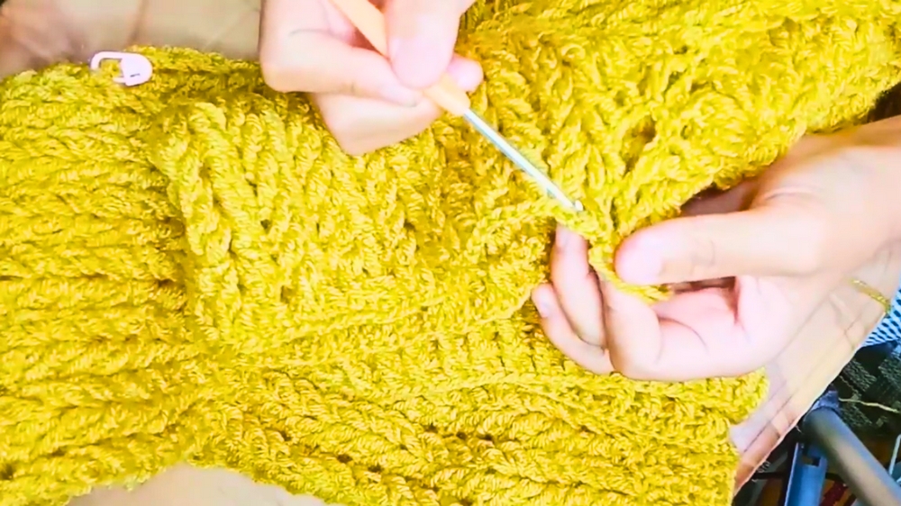 Strategic use of markers ensures accuracy in shaping the corners, which play a significant role in the garment’s overall structure. These corners consist of three groups of double crochets worked within chain spaces, allowing the sweater to expand evenly as it progresses.