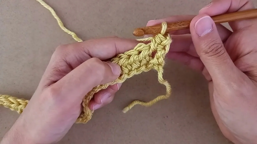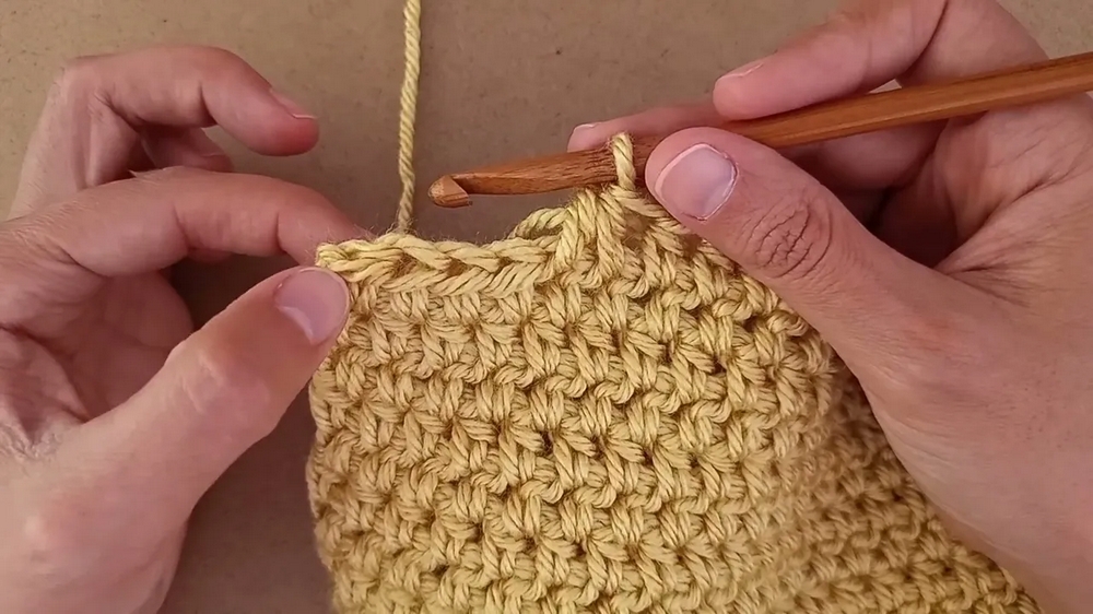 - For subsequent rows, turn the fabric, chain one (does not count as a stitch), and continue crocheting HDC stitches while picking up all three strands of each stitch. Repeat until the fabric measures approximately 11 cm, finishing on the wrong side of the fabric.