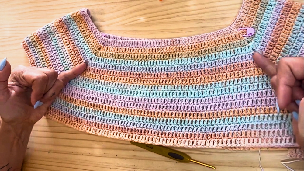 To ensure your blouse fits perfectly, regularly measure it against your body while working. Cotton yarn tends to stretch slightly over time, so create a snugger fit instead of making it too loose from the start.