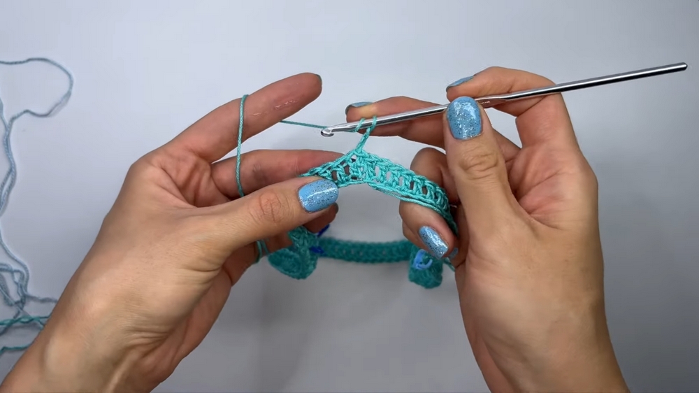 The pattern begins with a chain tailored to the wearer’s head circumference, which sets the foundation for the neckline. This chain is divided into specific portions: two sections for the shoulders, one for the back, and one for the front.