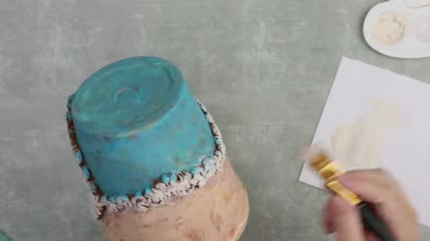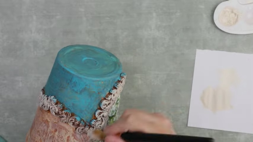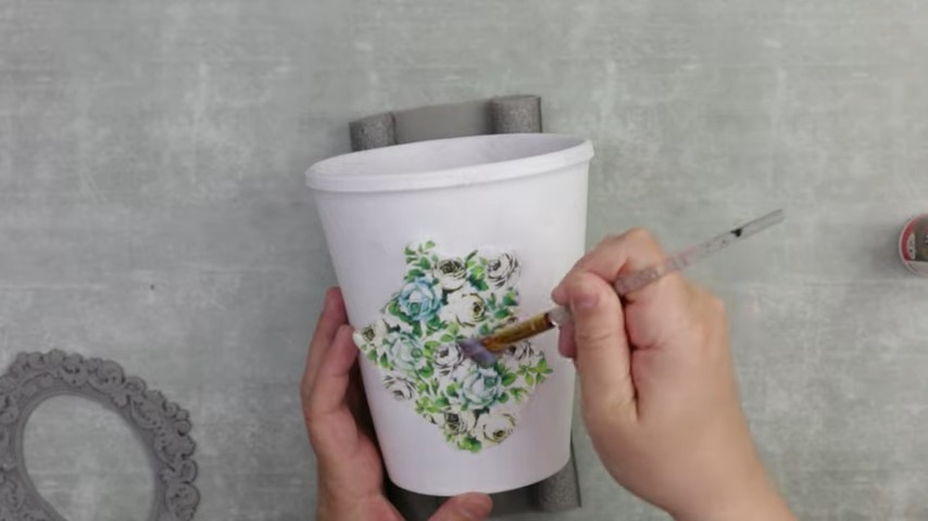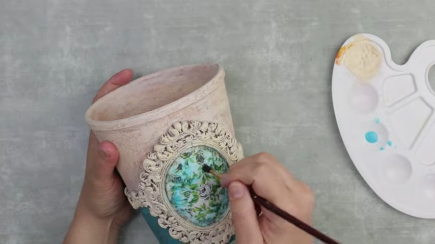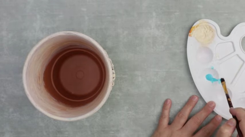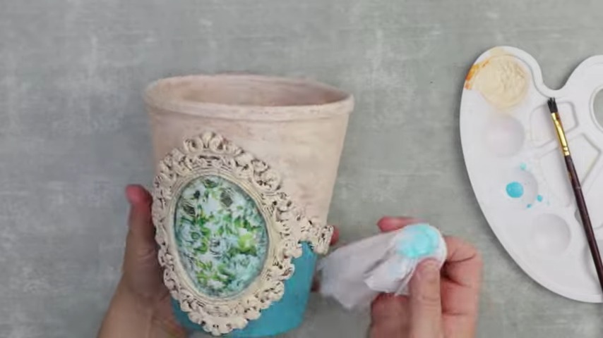 Color Distribution: Apply a creamy white paint on the majority of the pot, excluding a small portion underneath the garland. After the final layer, introduce vintage-style sky-blue paint to the unpainted section.