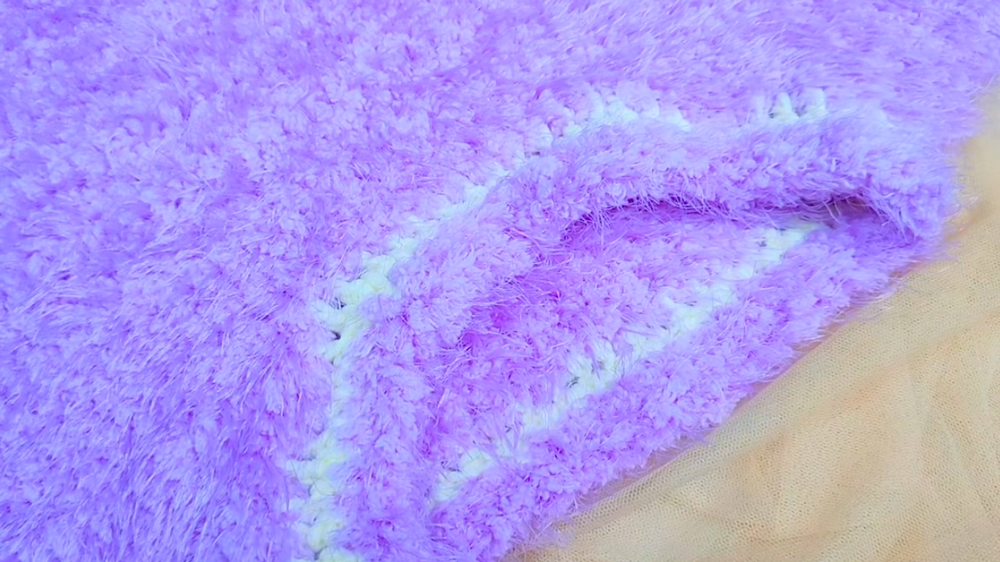 The design incorporates alternating rows of double crochets (DC) and strategically placed increases, creating depth and structure in the piece. Special tips ensure working with furry yarn is seamless, such as recommendations for counting stitches to maintain consistency.