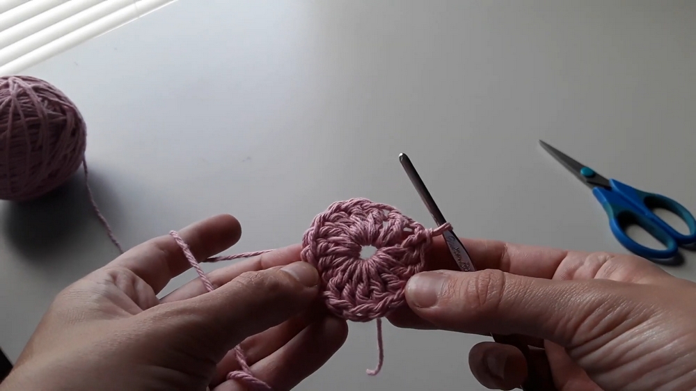 The process begins with a slipknot and a starting chain of six stitches, forming the core loop from which the design radiates. This starting point builds into a foundation of 16 double crochets, establishing the rounded base.