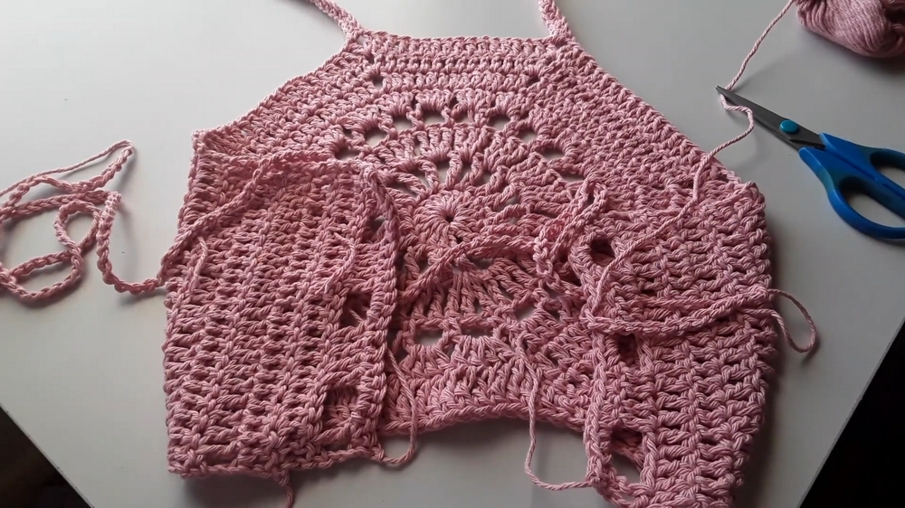 These strategic details, including the placement of spaced treble crochets, lend the design its airy charm and understated elegance. Further refinement comes with practical details like neck straps, formed by chaining 75 stitches and reinforcing them with single crochets for added durability.Finishing touches focus on symmetry and polish, such as leveling the bottom edge with a combination of single, half-double, double, and treble crochets. Strengthened ties, woven through discreet lacing spaces on the sides, allow for adjustability, ensuring a flattering fit for various sizes.