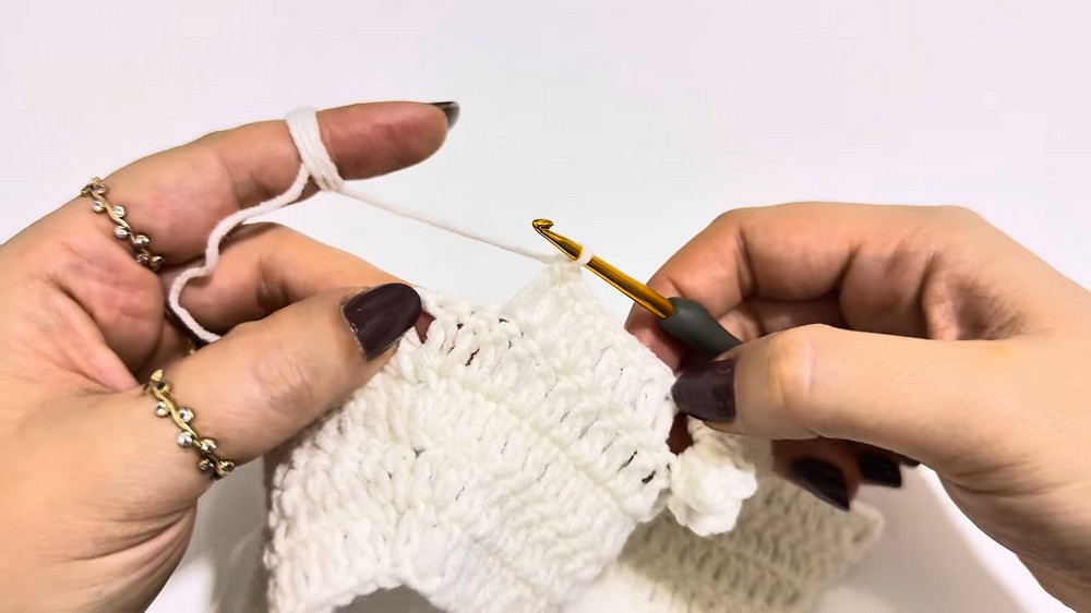- After the Right Front (10 sts): Insert 1 dc, chain 1, followed by a second dc in the same chain space for the increase.