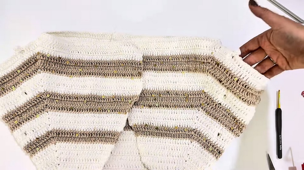 To create the V-shape neckline, increase 1 dc at the row beginning and row end progressively for the front pieces.