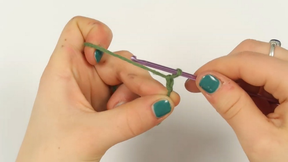 - Wrap yarn around your index finger twice, use the crochet hook to pull the second loop under, and tighten while removing your finger.