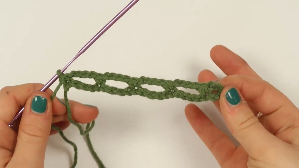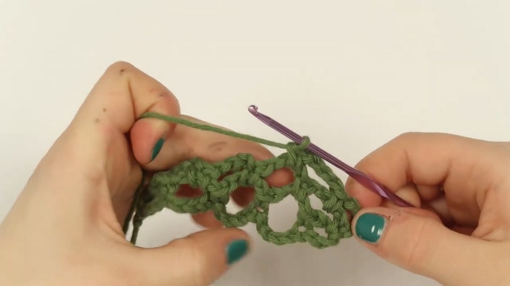 - Repeat this sequence (chain 4, sc into the next open space) until the end of the row.