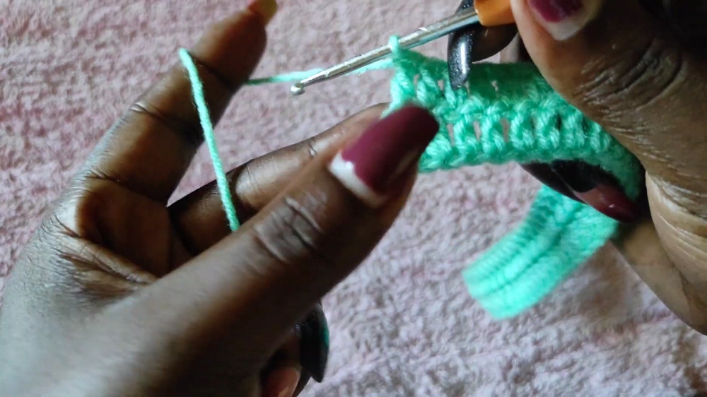 - Attach straps at the slanted side, using 5-row double crochet stitches.