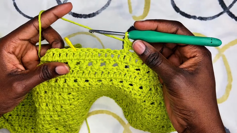 - Use decreases (double crochet two together) at the edges to shape the curved neckline.