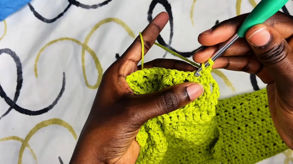 - Alternate between Row 1 (DC) and Row 2 (crossed DC) until the vest reaches the desired height.