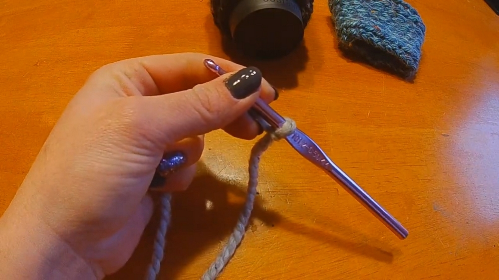 - Insert the hook into the first stitch, pull up a loop (three loops on your hook).