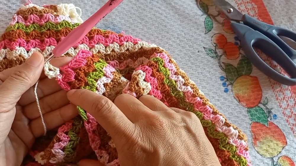 The tutor recommends using any leftover yarn you may have. She used six different colors, including shades of pink, green, and brown. Each color blends beautifully to create a vibrant, eye-catching blouse. For the crochet needle, she suggests a 3mm needle but advises adjusting the size depending on the thickness of your yarn.