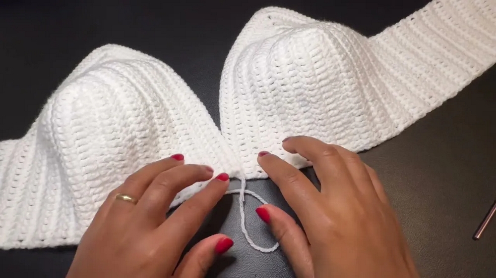 The initial steps of the process focus on forming the bra cups and adding extensions, each carefully stitched to create symmetrical shapes. Once joined in the center, the bottom section is adorned with diamond stitches aimed at forming an eye-catching texture.