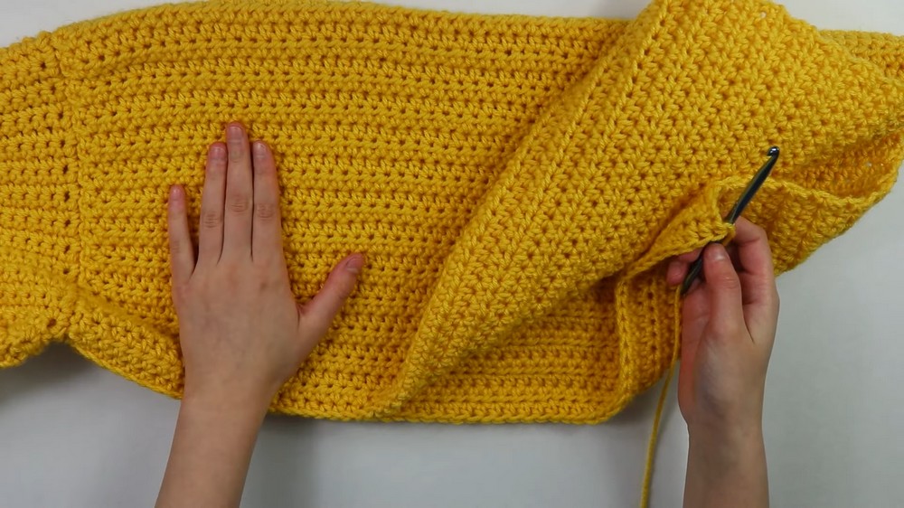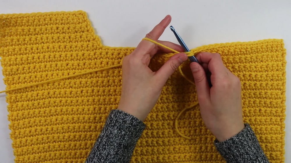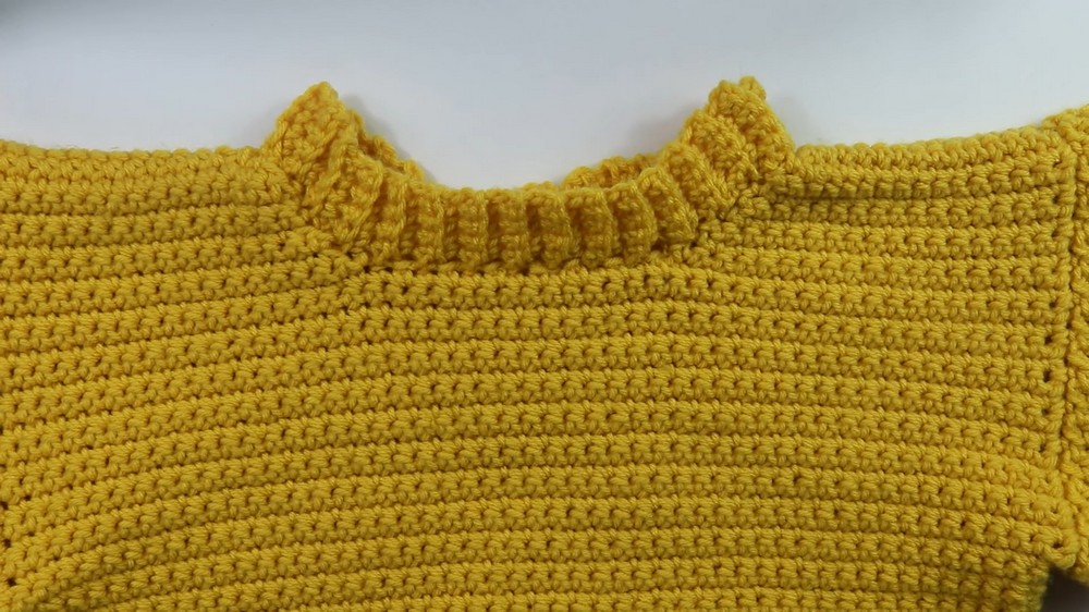 This sweater starts with creating the structured bottom border using back bar single crochets. The front and back panels are designed with simple rows of single crochets, making the process beginner-friendly despite its sophisticated appearance.