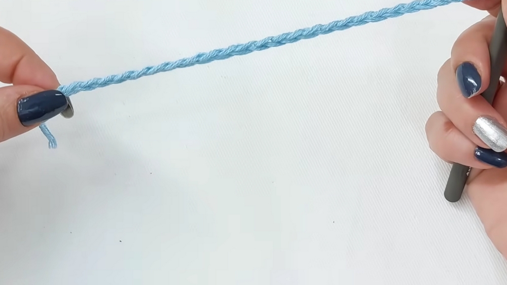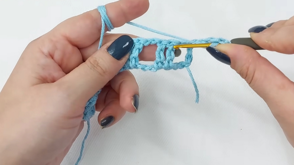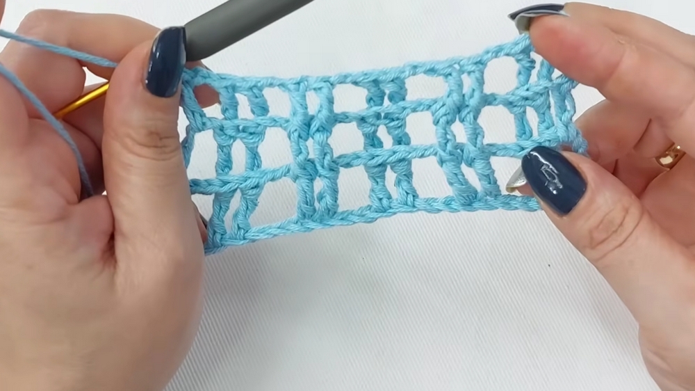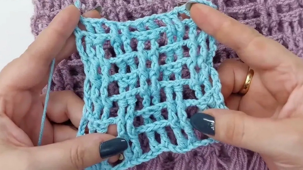 The process starts by pulling a long chain that adapts to your desired length. What makes the shawl so captivating is its layering technique: rows of triple handrails interspersed with delicate spaces, creating a lattice-like texture.